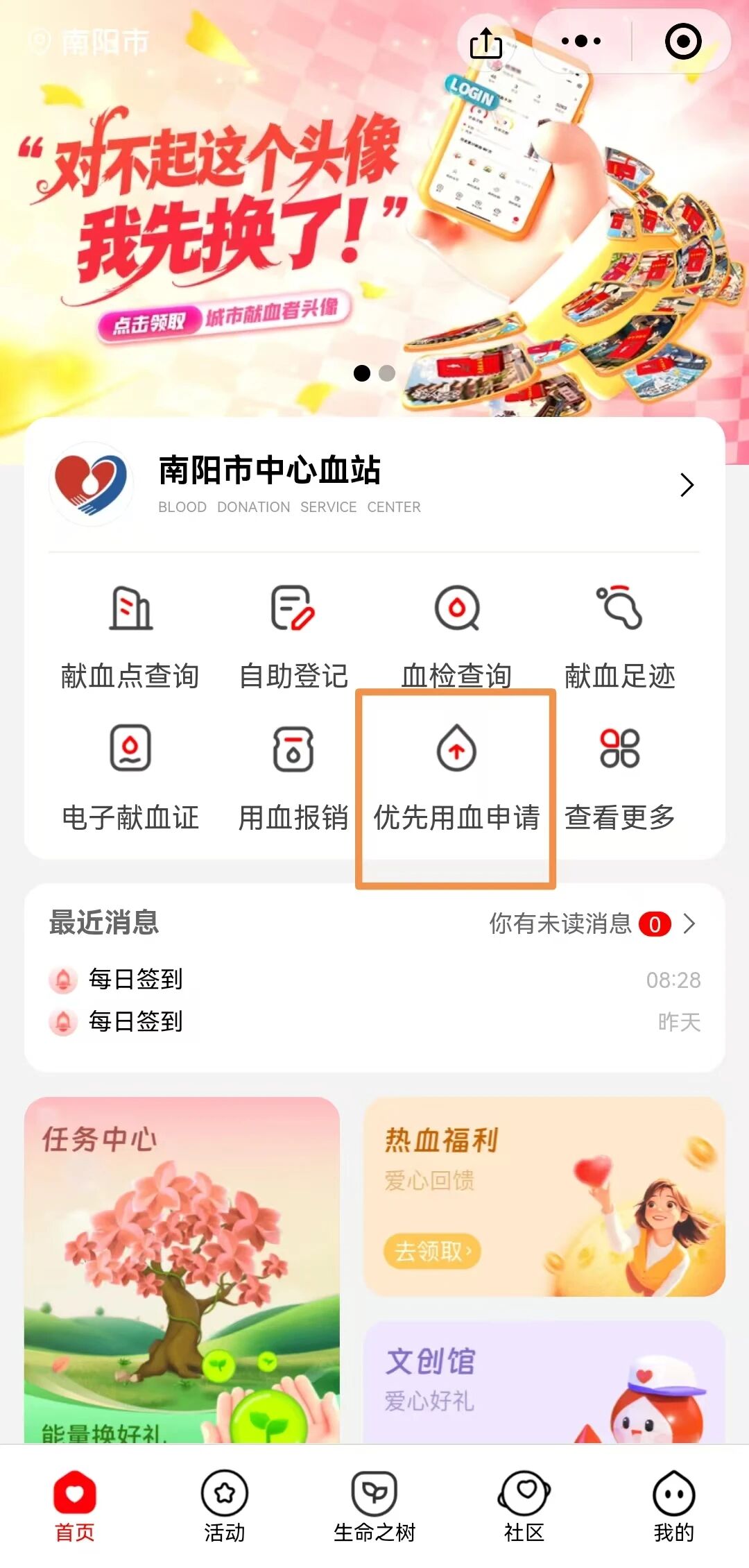 為進(jìn)一步落實(shí)我市無償獻(xiàn)血者優(yōu)先用血的相關(guān)政策,保障無償獻(xiàn)血者權(quán)益,提升廣大無償獻(xiàn)血者的榮譽(yù)感和獲得感,全面兌現(xiàn)獻(xiàn)血者本人及家庭成員應(yīng)享有的優(yōu)待福利,南陽市中心血站推出無償獻(xiàn)血者優(yōu)先用血線上辦理業(yè)務(wù)。現(xiàn)將有關(guān)事項(xiàng)告知如下: